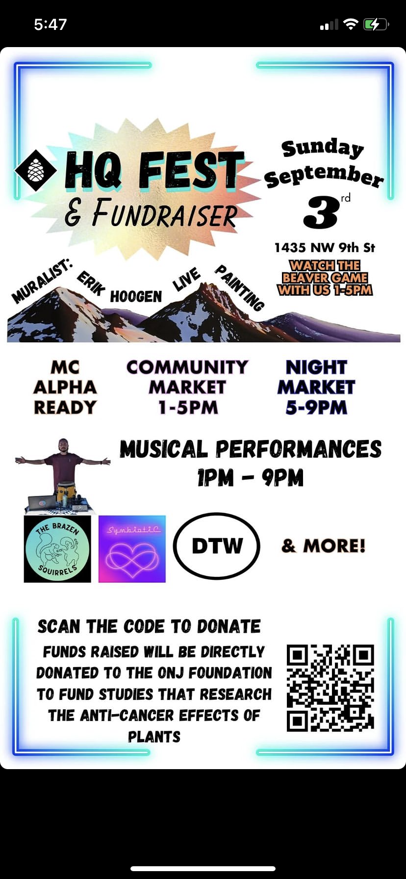 Join us at High Quality for an amazing community market, live mural painting, a fundraiser for plant-based cancer research, and The Beavers game!